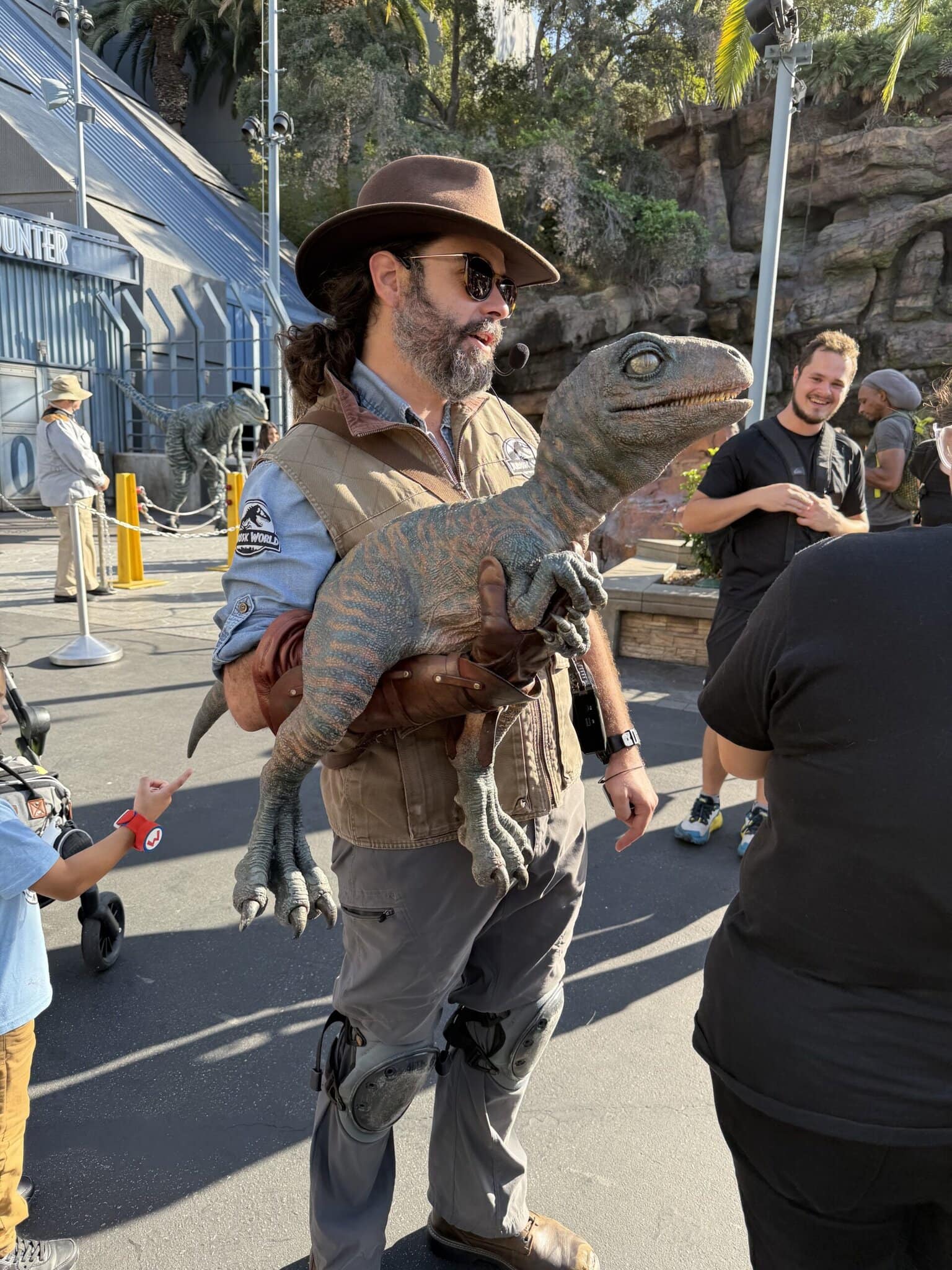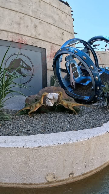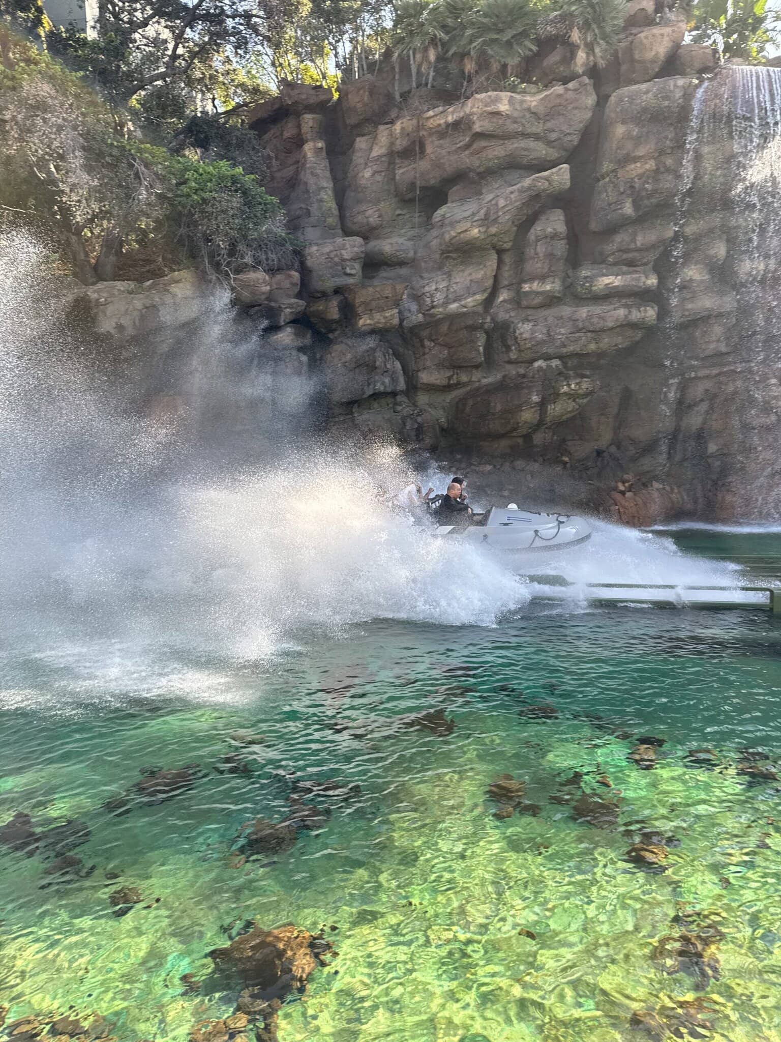 Druhý největší zážitek byl určitě Jurský park. 🦖 Otevřely se před námi ty obří ocelové dveře, přesně jako ve filmu, začala hrát ta známá hudba a my tam vpluli na člunu mezi obrovská akvária s pohybujícími se prehistorickými příšerami, která nás sem tam postříkali vodou jako by se chystali hned zaútočit. Měla jsem husí kůži. Jasně, že člověk ví, že si v parku nenechají „sežrat“ klienty, ale když se za námi v tunelu zavřely dveře, byli jsme opravdu v příběhu. A pak, kdo ví? Pluli jsme skrze scénu, kde se před námi tyčili dinosauři. 🦕 No a když nám vámi šustí prales a jeden dinosaurus vyleze vedle vás i z vody, tak vám srdce poskočí a dech se zastaví. A než jsme se nadáli, přišel závěr v podobě volného pádu, naštěstí i se člunem do řeky. Nebezpečí zažehnáno a „jako třešnička na dortu“, focení se „skutečným“ velociraptorem. Pořád jsem se otáčela, kdy mně kousne do krku.