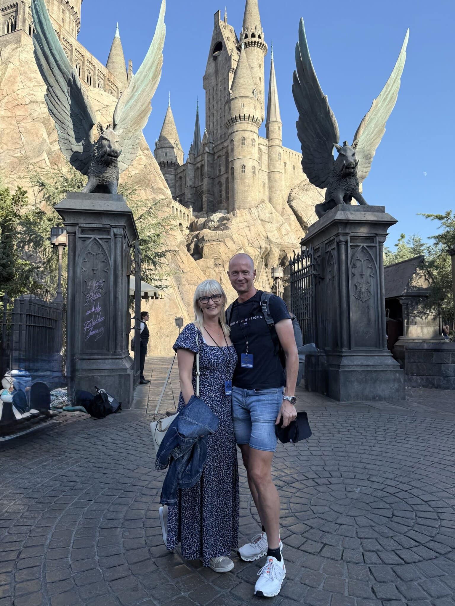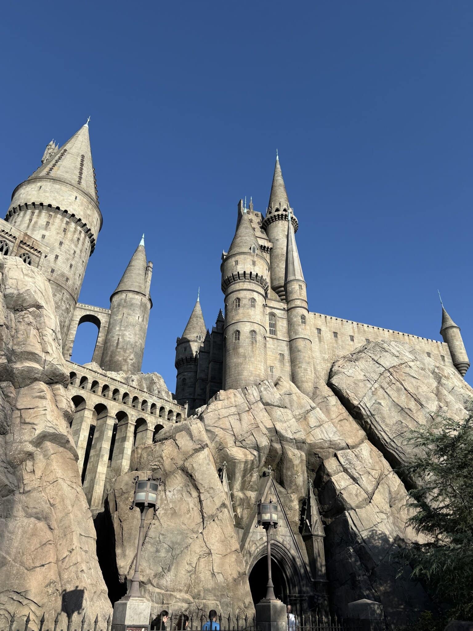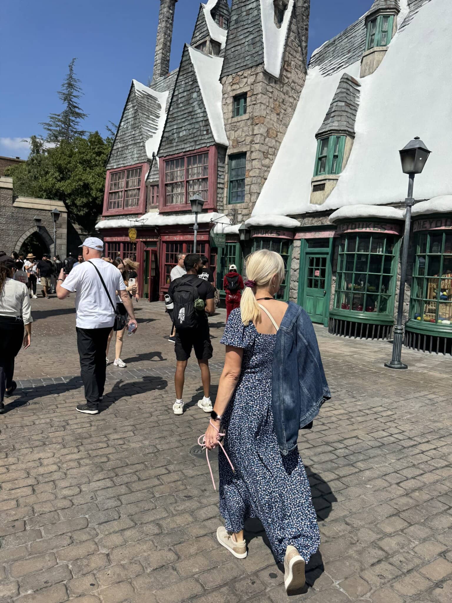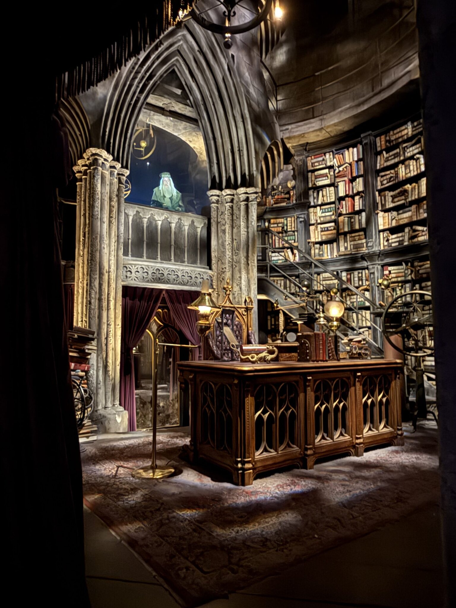 A pak přišel ten můj okamžik! Stála jsem před hradem z Harryho Pottera. Před hradem v jeho „životní“ velikosti. 🏰 Už jsme sice dříve navštívili filmová studia v Londýně, kde se skutečně natáčelo. Tam ale mají pouze velký model hradu. Tady v Hollywoodu je to dočista jiný level. Celý hrad je vybudovaný do posledního detailu, zasazený do skal, jako by tam stál odjakživa. Když jsme vešli dovnitř, připadala jsem si, že jsem vstoupila přímo do filmu. 🎞️ Pohyblivé, mluvící obrazy na stěnách u schodiště, Brumbál ve své pracovně, Harry, Ron a Hermiona v sále, kdy tam všichni jsou přítomni mluví, díky skvěle udělanému hologramu.