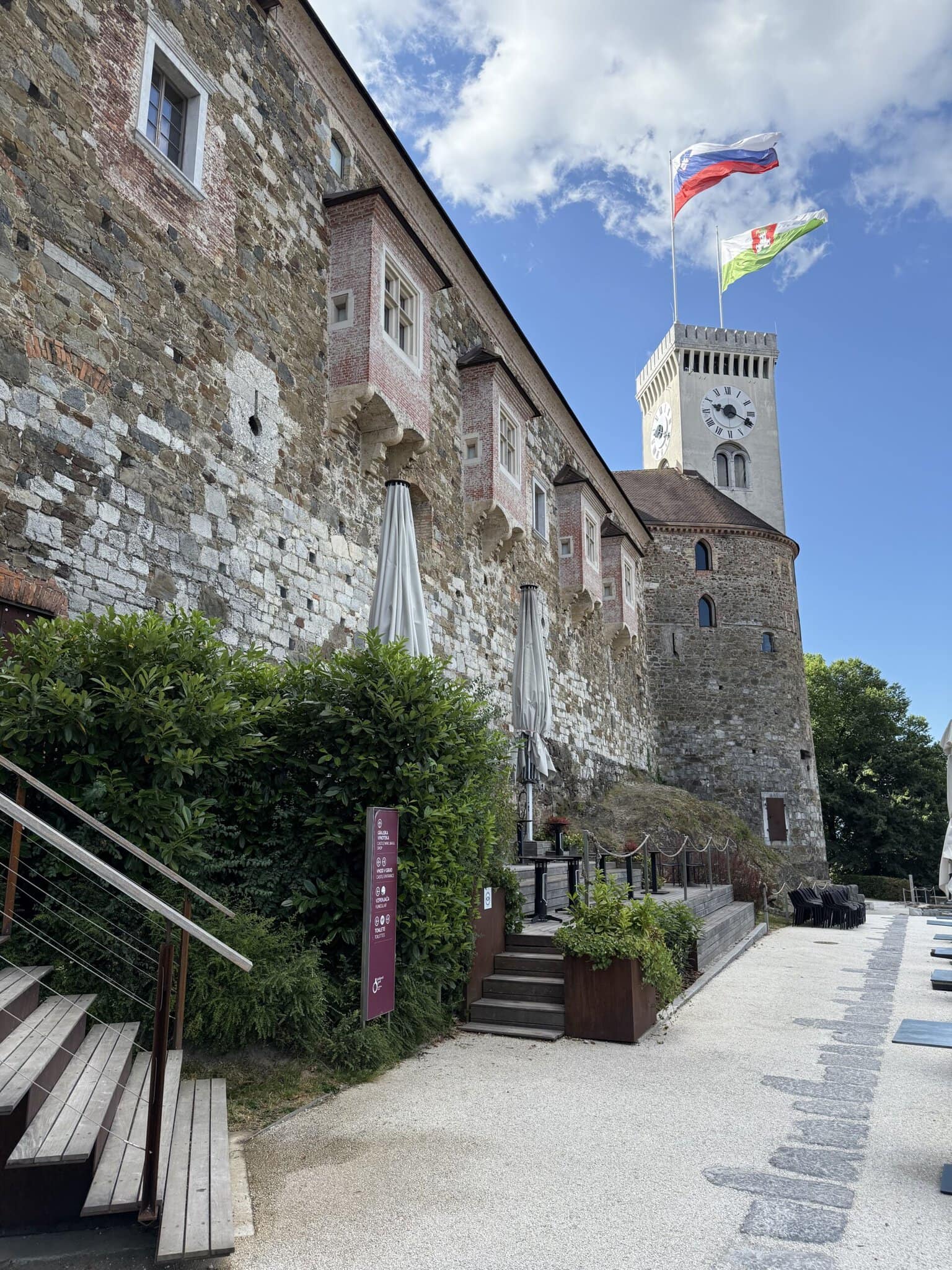No a pak šup, doporučuji hradní kavárnu, kterou nemusíte hledat, protože se nachází přímo na velké terase v srdci hradu. ☕️Ukořistili jsme si strategicky výhodné místečko a tam jsme si poseděli s větrem ve vlastech a s Proseccem v ruce. 🥂 Dali jsme si kávičku i něco „na zub“ a dělali jsme, že tam „bydlíme“. Proč? Protože na dovolené se nespěchá a na dovolené se může všechno. 😂 Komu by byla málo slunná terasa, tak naproti kavárně je hradní restaurace se slovinským menu anebo pro fajnšmekry je v prostorách hradu i michelinská restaurace.