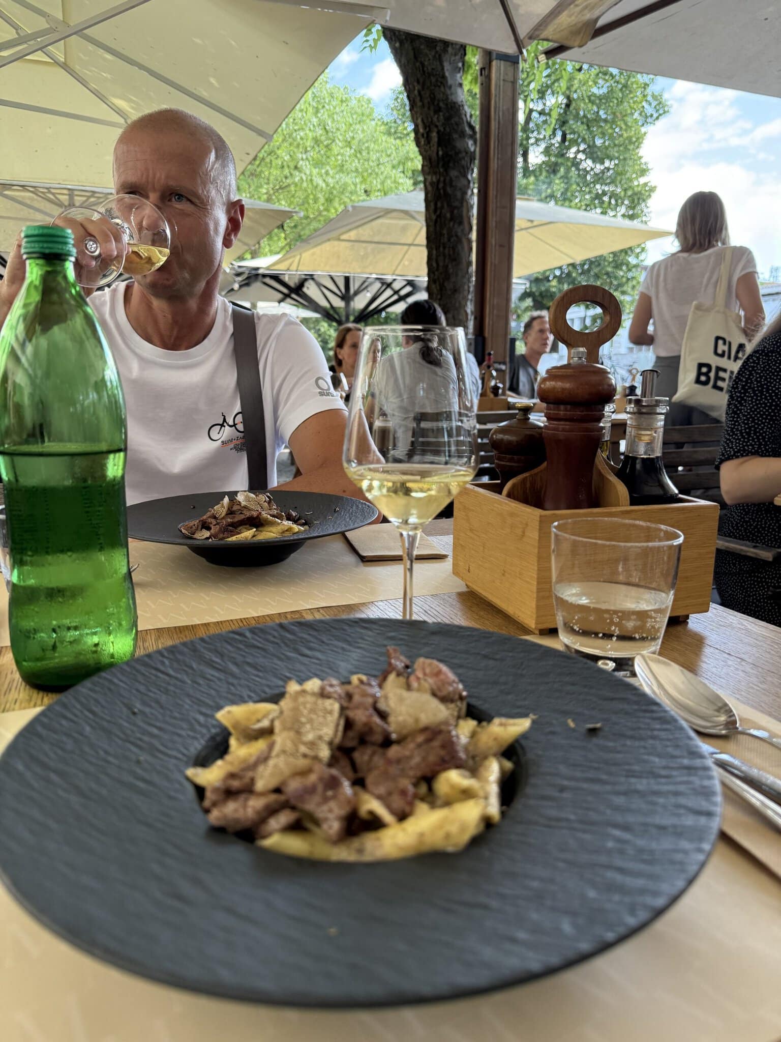 My jsme se na oběd vrátili zpátky do víru centra města. A jak jinak si vybrat restauraci na oběd než podle zaručené metody, kde je plno, tam to žije a vaří tam dobře. Zabodovali jsme napoprvé. Venkovní posezení, výhled na korzující davy turistů, kousek od nás šumění protékající řeky a před námi talíř domácích těstovin s hovězím masem, lanýži a parmezánem. K tomu sklenka skvělého Prosecca a můj muž naproti mně. 🍴 Prostě jako ve filmu. Až budete v Lublani a uvidíte přímo naproti jednomu mostu restauraci jménem Most, tak si na mě vzpomeňte, je to můj tip.