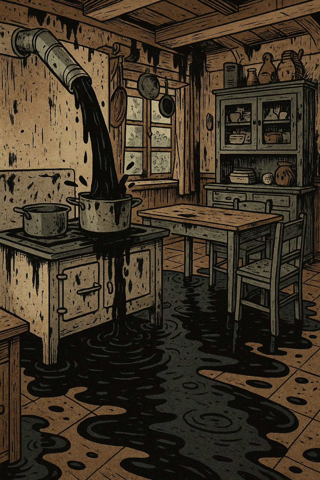 Ani odborná firma nevymění střechu ze dne na den, protože bohužel nejsme v pohádce „Ať žijí duchové“. 🧚♀️ A tady přišel na scénu starý dobrý „zákon schválnosti“, kterého dozajisté všichni znáte. Nikdo nezafunguje líp než „ON“. 😤 Co se mohlo stát? No jasně, nečekán, nezván přišel velký liják! ☔️ Jak to, tak bývá, pršelo dlouho a vydatně. Nejsme první ani poslední, komu zakrývací plachta povolila a voda si svoji cestu dovnitř našla na více místech, ale především se jí zalíbila volná cesta našim komínem. Celý ten černý, ulepený „bor…“ z komína stekl až dolů do kuchyně, rozlil se po stěnách, po nábytku, po linu, přetekl přes schod do níže položeného obývacího pokoje. No krásný to bylo! Ano, plavali jsme tam v černém koktejlu, v takové lázni z poctivých, letitých sazí. 🤦♀️